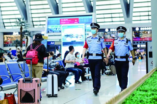 端午节期间,本市公安机关启动高等级勤务模式,广大公安民警、辅警坚守岗位,结合“我为群众办实事”实践活动,全力以赴维护社会治安,确保广大群众度过一个安宁祥和的端午假期。图为天津铁路公安处天津西站派出所民警在西站候车大厅巡逻,守护旅客平安出行。