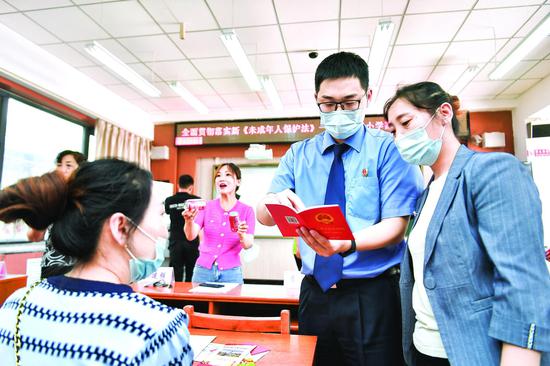 东丽区人民检察院检察官联合东丽区司法局工作人员走进东丽区新立村小学家长会,开展法治文化进校园活动。检察官以案说法,介绍未成年人相关法律知识,提醒家长增强法治意识,远离违法犯罪,当好孩子人生的合格导师。图为活动结束后,工作人员向家长发放法治宣传品。
