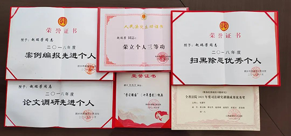 在繁重的审判业务之外,赵瑞芳还多次利用业余时间撰写调研、信息及宣传,共参与撰写了2篇调研文章,20余篇信息。2021年由赵瑞芳同志作为主执笔人撰写的《职务犯罪相关问题研究》获得省高级人民法院优秀奖荣誉。此外,赵瑞芳同志还带头将全院审理的涉黑恶案件全部编写为以案释法案例,并通过区扫黑办下发到各街道及村委会等,通过案例宣传,增强了群众的法律意识,对违法犯罪分子以有力震慑。