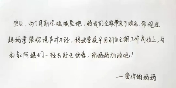 她给自己刚满两个月的宝宝这样写道:“宝贝,两个月前你呱呱坠地,给我们全家带来了欢乐,而现在妈妈要跟你说声对不起,妈妈要提早回到自己的工作岗位上,与叔叔阿姨们一起去赶走病毒,给妈妈加油吧!”。