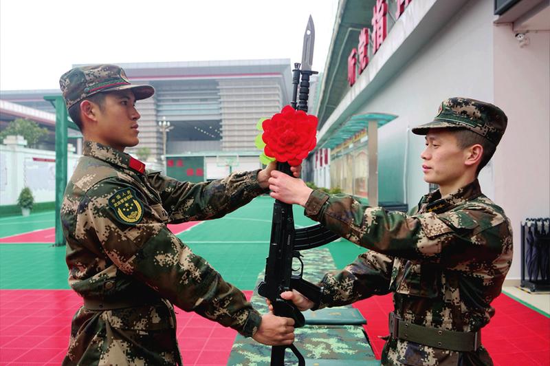近日,武警贵州总队贵阳支队执勤七中队举行新兵授枪仪式,仪式上,新兵精神抖擞、士气高昂。全体新兵在队旗下宣誓:“我有勇气扛起这面队旗,我更有勇气为了党和人民的利益第一个牺牲,我会永远铭记中队的光荣历史,续写中队的辉煌……”图为新兵接过属于自己的钢枪。
