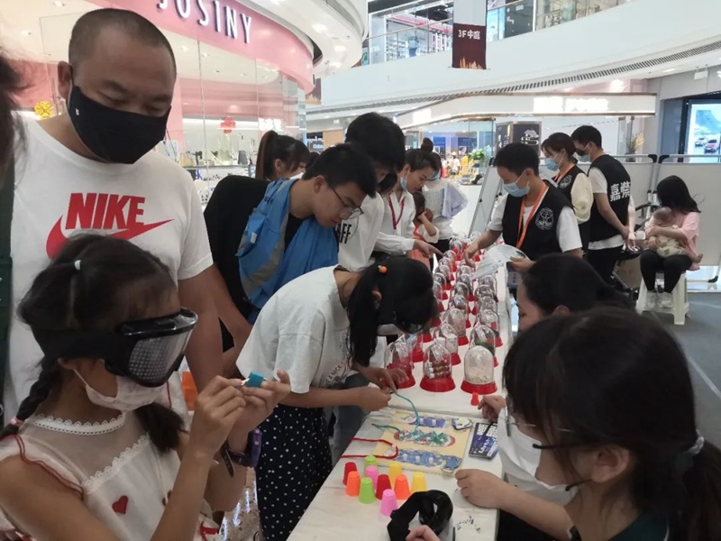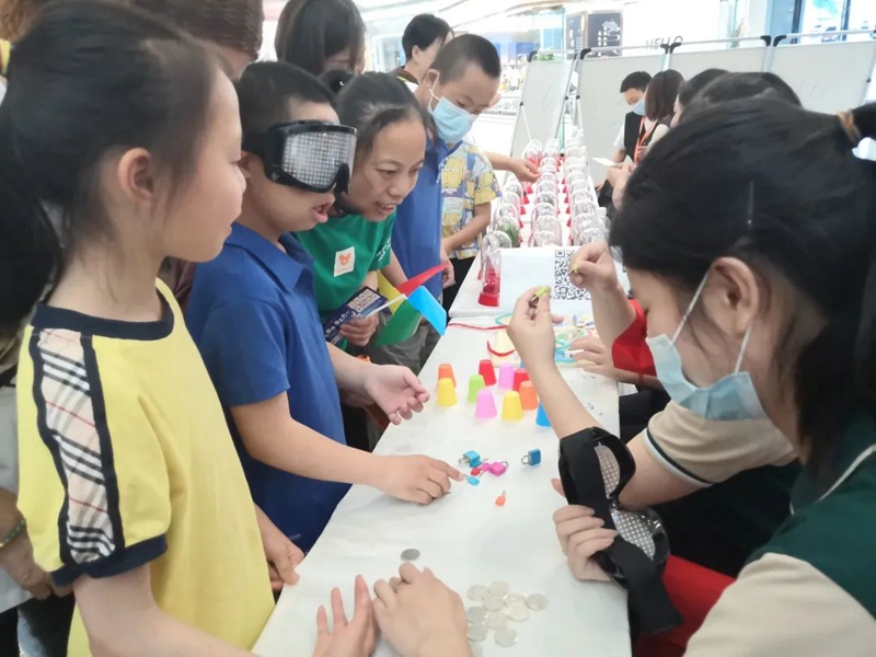 活动中,区禁毒办⼯作⼈员向来往群众发放禁毒宣传单、宣传⼿册,介绍毒品的种类,提醒广⼤小朋友要有警觉戒备认识,提⾼对诱惑的警惕性等等,以此让他们充分认识到毒品对社会造成危害的严重性,努⼒增强群众对毒品的认识,使禁毒宣传教育活动更加深⼊⼈心。此外区禁毒办工作人员还为小朋友们准备了叠杯子、系鞋带等小游戏。游戏过程中,小朋友们需带上准备好的模拟吸毒人员吸毒后所见景象的眼镜,再完成平时生活中很简单的小游戏。不少家长也会拿起眼镜来试用并感叹到:“戴起看啥子都是晕晕的!”