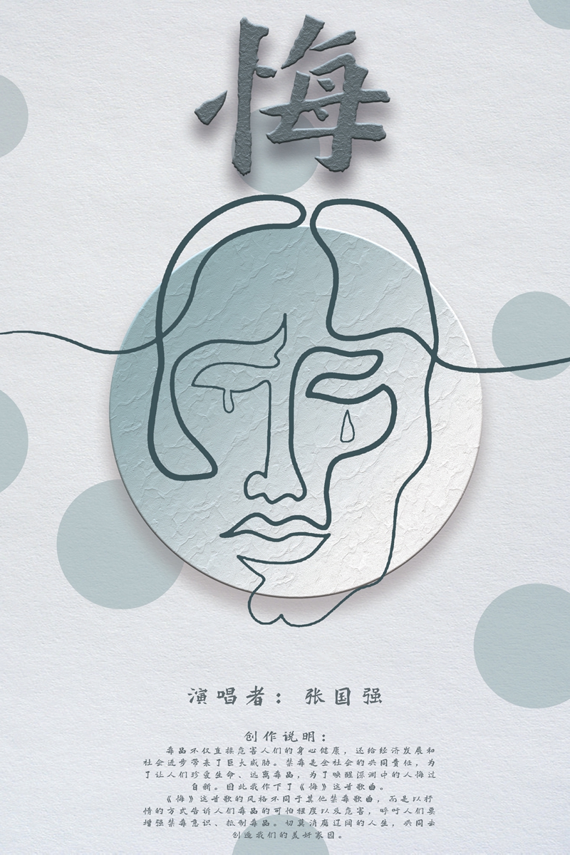 毒品不仅直接直接危害人们的身心健康,还给经济发展和社会进步带来了巨大威胁,禁毒史全社会共同的责任,为了唤醒深渊的人悔过自新,作者创作了歌曲《悔》。《悔》这首歌风格不同于其他禁毒歌曲,而是以抒情的方式告诉人们毒品的可怕程度以及危害,呼吁人们要增强禁毒意识、抵制毒品,切莫消磨人生,而要共同去创造我们的美好家园。