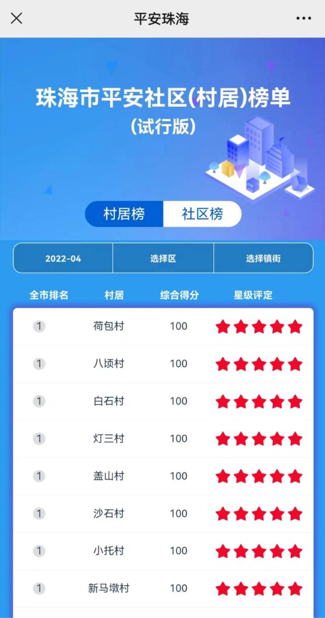 今年初,珠海依托“平安+”指数平台开展覆盖全市村(居)的平安状况星级评定工作。3月,首期平安星级村(居)评定结果出炉,115个村(居)入选,居民可通过平安指数微信公众号快速查询、直观感受各村(居)平安状况。