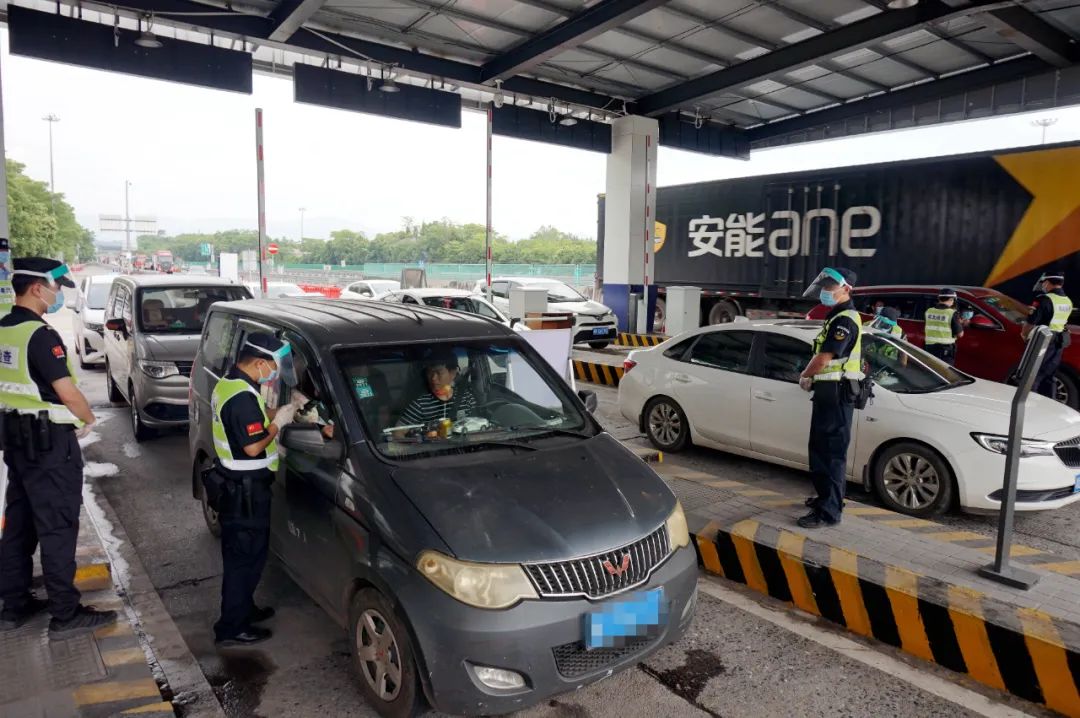 在粤北省际公安检查站,警务人员在入粤的通道上核查登记车辆。