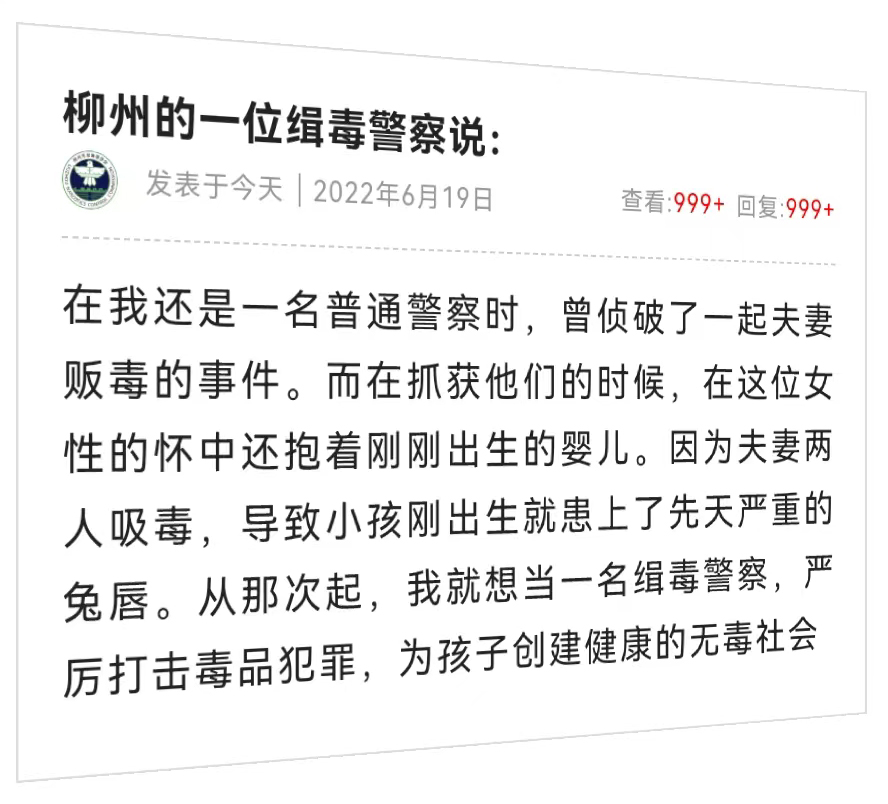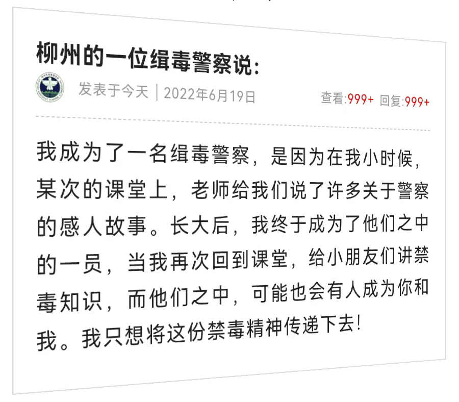 后来长大了,我沿袭了你的脚步,穿上警服、戴上那个光荣同时承受重任的警帽,成为一名缉毒警察。我才真正了缉毒民警的苦和累。我作为一名内勤,虽然不用像你当年冒险奔波、枪林弹雨,但繁重锁碎的数据整理,情报研判、报告报表也能满满充实着每日工作。面对紧急事件和重要任务,加班熬夜成为家常便饭。走过你当年走的路,终于体会你心中承受的那份压力和重任。终于体会每每你从梦中醒来还紧紧抓着妈妈的衣领,大叫不许逃的紧迫。终于了解每次你离家前回头的叮嘱都是对我的默默地关注。我知道你热爱你的工作,你努力想为我们下一代创造一个良好的社会环境,实现天下无毒的梦想。爸爸岁月已逝,现在的你退休了,你要好好保重自己的身体,安心享受你的晚年生活,你未完成的梦,由我们帮你实现。希望你一切安好。