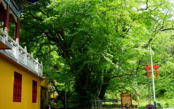 青檀古树伫立在双泉寺东侧,树大约十二人合围,高约六丈余,冠幅亩余,犹如一把撑天巨伞,又似一座历史丰碑。碧绿的叶子遮天蔽日,但没有丝毫古老的沉重、年迈的沧桑,甚至因为这棵树的历史悠久,枝叶更加繁茂,整棵树的气质都是充满生机与活力的。