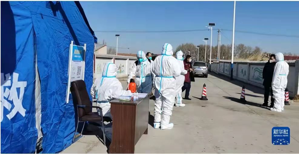 武川县上秃亥乡的疫情防控人员在村口卡点值守。
