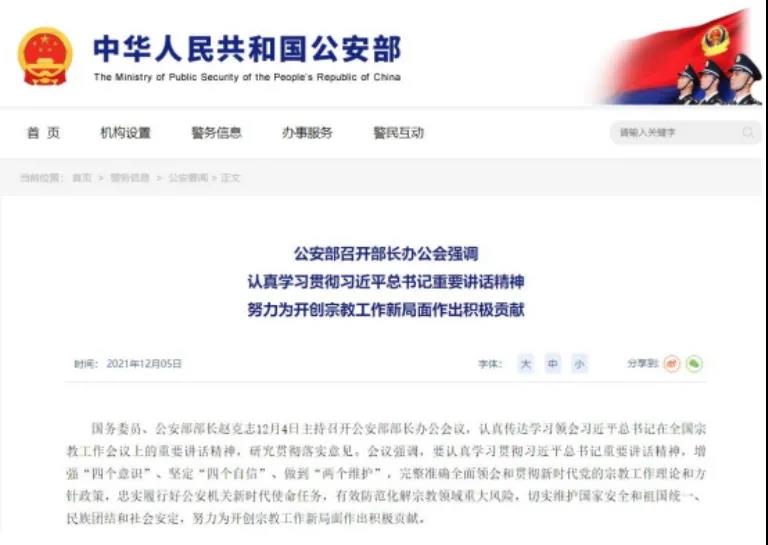 2021年12月4日召开的公安部部长办公会议上,国务委员、公安部部长赵克志强调,要依法打击整治邪教和非法传教活动,始终保持对邪教和非法传教活动的严打高压态势。