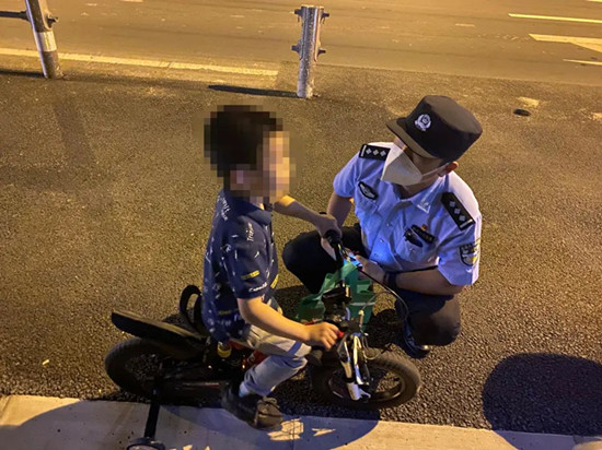 6月11日21时许,上海市公安局松江分局洞泾派出所民警在巡逻途中看到一位小男孩独自骑着儿童自行车,旁若无人地在马路上快速逆向骑行,此时周边过往车辆不断,情况十分危险。民警见状立即将小男孩拦下,在询问过程中得知,小男孩是在父母不知情的情况下,独自骑车离开小区想找可以一起玩耍的小伙伴,结果越骑越远。