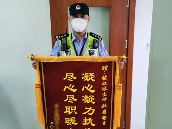 控江路派出所民警韩勇在疫情期间帮助小区居民采购生活物资以及配送药物,解决了小区居民的急难愁盼问题,为此居民们专程为韩勇送上了锦旗,表示感谢。