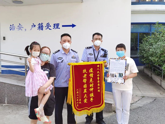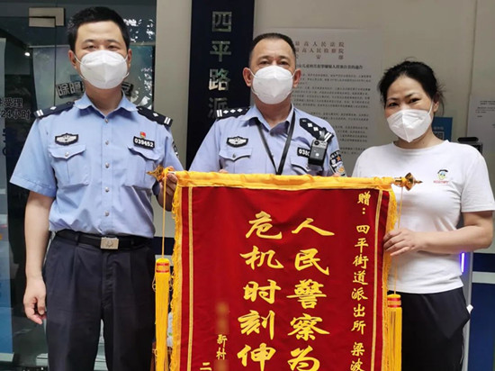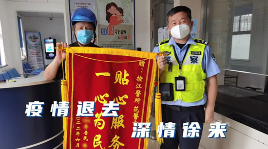 疫情平稳后,市民周女士一家第一时间来到中原路派出所将一面锦旗交到了民警袁治国手中。