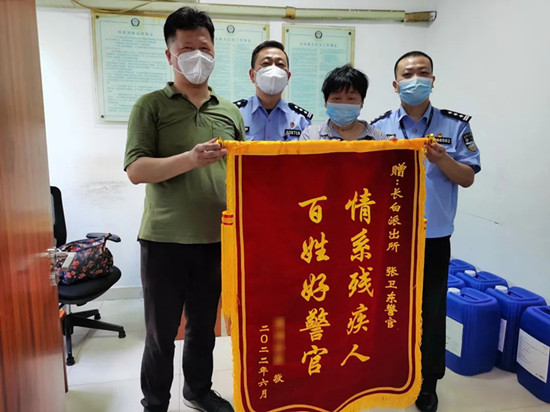 长白新村派出所社区民警张卫东在疫情封控期间,多次为小区内一行动不便的老人提供帮助,家属为此特地送来了锦旗表达了对民警张卫东的感激之情。