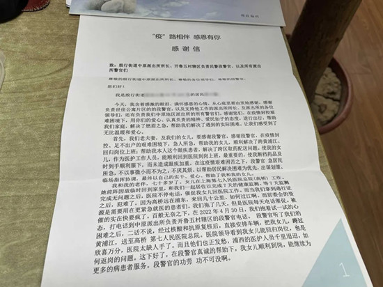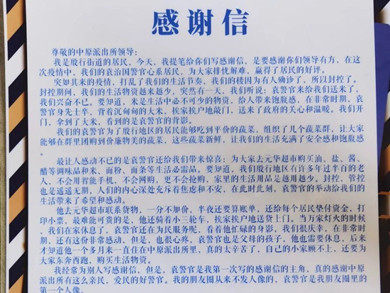 无独有偶,市民周阿姨也来到中原路派出所向一直帮助着自己和家人的社区民警段翌麟送上感谢信。疫情期间,段警官多次帮助市民周阿姨第一时间解决生活及配药难题,为此老人由衷地向其表示感谢。