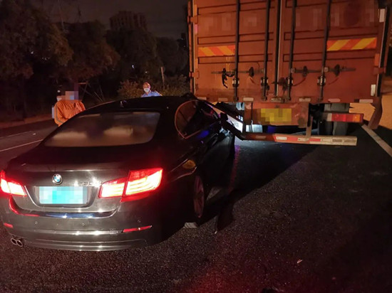 2022年6月6日凌晨,洞泾派出所接到路人报警,称在洞业路上有一辆小轿车追尾了货车,挡风玻璃破损,轿车车头被压在货车下,驾驶员伤亡情况不明。