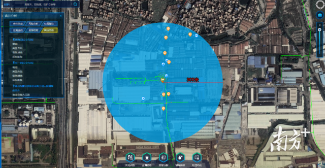 佛山市城市安全运行监测中心系统接报一处燃气井出现可燃气体浓度超限报警,系统分析报警点周围防护目标情况。