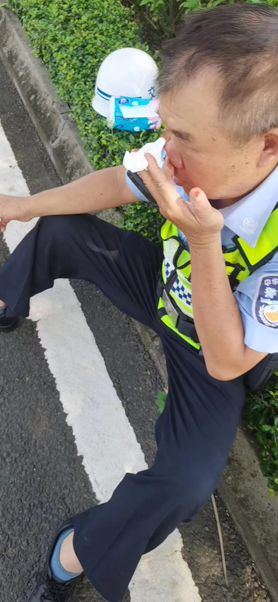 炎炎烈日下,连续在路面执勤几个小时的交管一大队执勤路管员郑国霖满脸通红,衣服已被汗水完全浸湿。12时30分许,郑国霖步履蹒跚地走向一同执勤的同事,“我头很晕,鼻子还流血了。”看到郑国霖鼻子里流出鲜红的血,同事立马将其扶回阴凉处,简单处理后,鼻血得到了有效控制。