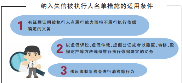 草案还明确了纳入失信被执行人名单措施的适用条件,包括:有证据证明被执行人有履行能力而拒不履行执行依据确定的义务;以虚假诉讼、虚假仲裁、虚假公证或者以隐匿、转移、毁损财产等方法逃避履行执行依据确定的义务;违反限制消费令进行消费等行为。