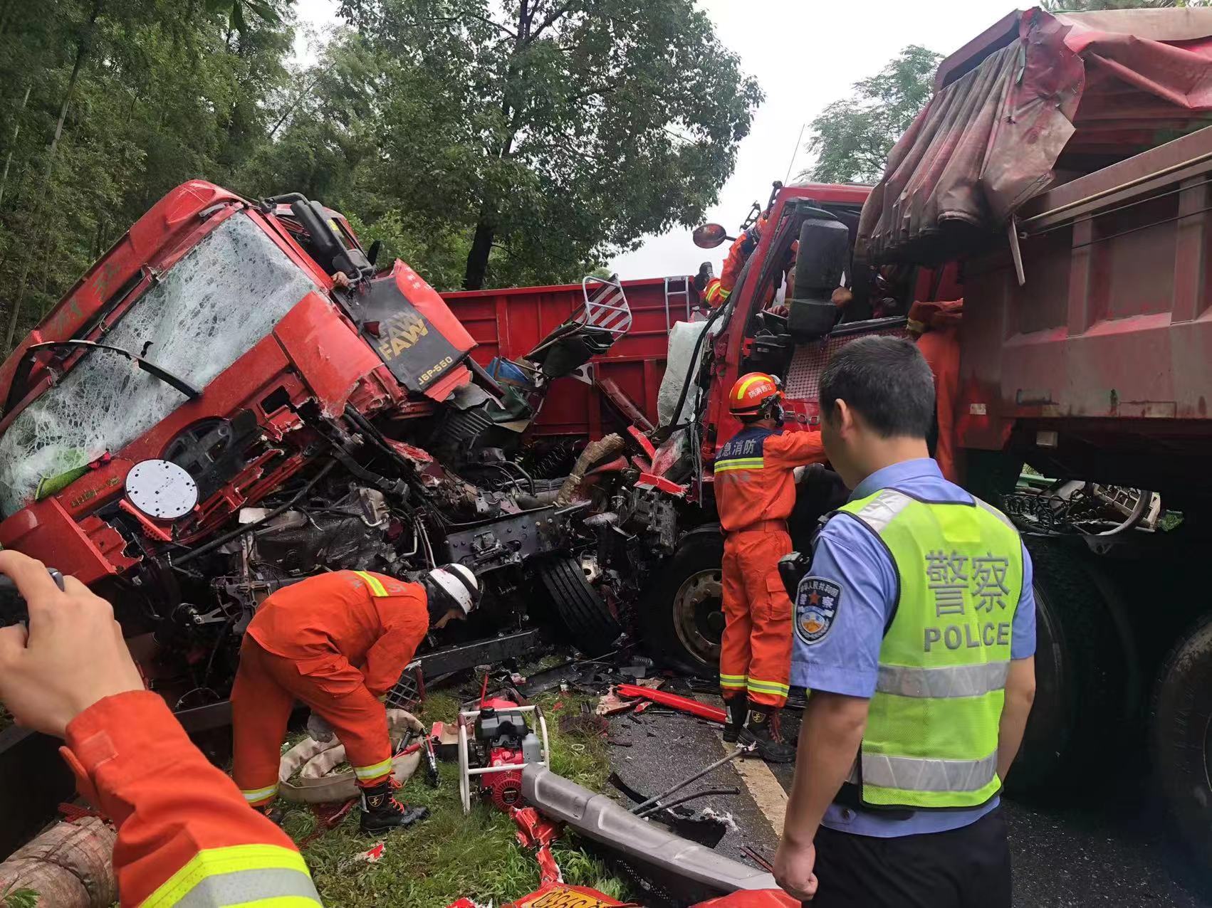 2022年6月20日上午10点左右,江西吉水县八都镇与永丰县交界处发生一起交通事故,两辆重型半挂牵引车在G322国道正面相撞,车头均严重变形,司机被卡驾驶室动弹不得,且路面撒满了货车油箱泄露出来的油,地面十分湿滑,情况十分危急。 事发后,吉水县公安局交警大队八都中队民警立即启动紧急预案并第一时间赶到现场。车祸发生地在两县交界处,使本车流较大的路面更显拥堵,为了避免二次事故的发生,交警对事故现场采取临时交通管制,同时也为医护人员和消防队员尽快到达现场实施救援创造条件。“警察同志,快把我拉出来!我难受!”伤者的呻吟声不断不断从车内传出。“师傅,坚持住,千万不要乱动,消防队马上就来了,我们马上就能救你出来了。”民警耐心地安抚着被困人员。 不久,消防救援人员、120急救人员便到达现场,大家立即分工合作,由于两辆半挂货车的司机驾驶室严重变形,驾驶员双腿被死死卡在驾驶台之间无法脱困,血流不断。经过仔细勘察后,消防官兵利用破拆工具,液压扩张器等奋力施救,小心翼翼把驾驶室撬开,最大限度地避免伤者受到二次伤害,经过数分钟紧张救援,交警、消防、急救人员终于齐心将驾驶员从驾驶舱内抬出来紧急就医。 随后,交警联系清障车将受损车辆移开,由于受损的两辆半挂货车占了大幅路面,又受降雨天气影响,给现场清理工作带来一定的影响,该路段暂时只能单向通行。从事故发生到险情排除,民警克服种种困难,在恶劣的环境下持续冒雨疏导4个多小时,通过一系列有效措施,确保道路安全有序的同时保障了群众生命安全。目前伤者伤情稳定。