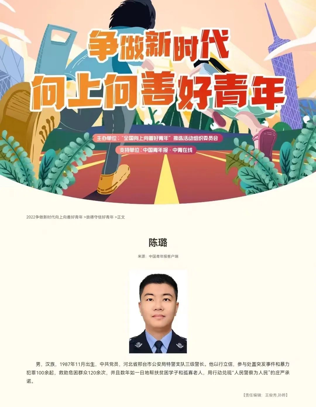 共青团中央近日公布2022年“全国向上向善好青年”名单,我省邢台市公安局特警支队三级警长陈璐从全国3.2万名候选人中脱颖而出,光荣入选。
