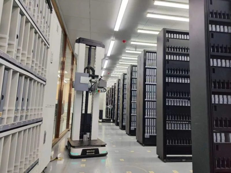 在“智能中间库”材料保管区内,会配备2个AI管理员,对材料进行智能存取。法官可提前在手机上预约材料,在AI管理员接收到指令后,会自动将存储在文件架上的对应材料,存放到材料交互区的中转平台,方便法官随时存取。