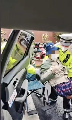 两位老人尝试了几次想把残疾的儿子抱上车,但都没有成功。正在一筹莫展、万分焦急时,一边维持秩序一边早已关注他们的王永华、张辉立即主动上前。原来轮椅上的患者是老夫妻的儿子,因身体行动不便无法自行上车。王永华将患者轻轻抱起,张辉则到出租车的另一边从车内接好,二人合力将老人的儿子安全抱上车,老人不住道谢。