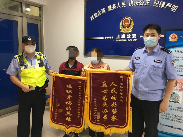 图说:考试后小黄同学在父母陪同下至派出所向民警赠送锦旗。普陀公安分局供图