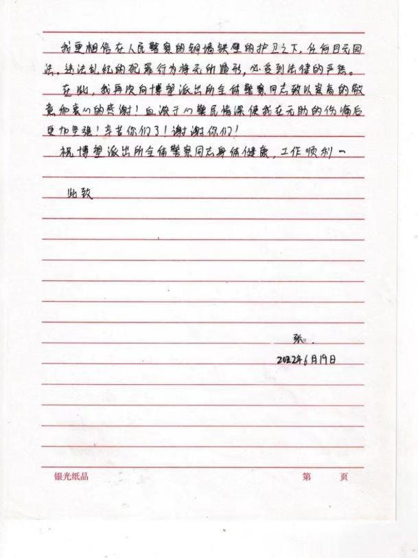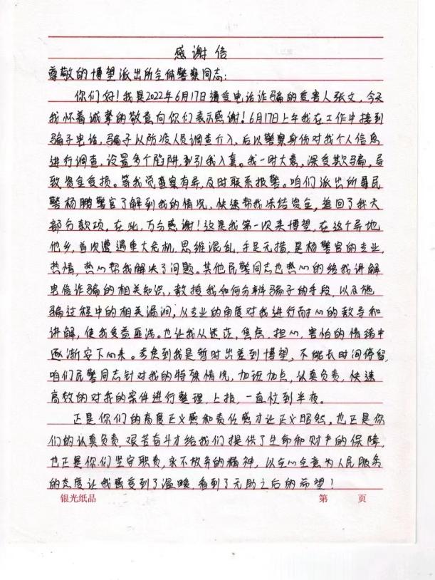 来自西安市的张女士遭遇冒充“公检法”骗子的电信诈骗,直到转账后才意识到被骗,于是立即报警。接到张女士报警后,马鞍山市博望警方火速将张女士的银行账户冻结,止损6万元。事后,为表达感谢,张女士特意将一封亲笔写的感谢信和一面印有“人民警察为人民 危急时刻伸援手”的锦旗送到博望派出所。