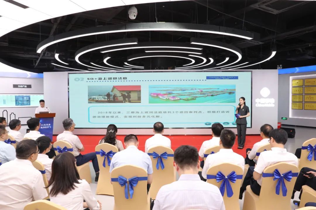 6月30日,在中国移动“5G海洋发布会”现场,法院干警为在场嘉宾介绍蕉城法院5G三都海上巡回法庭的“前世今生”。