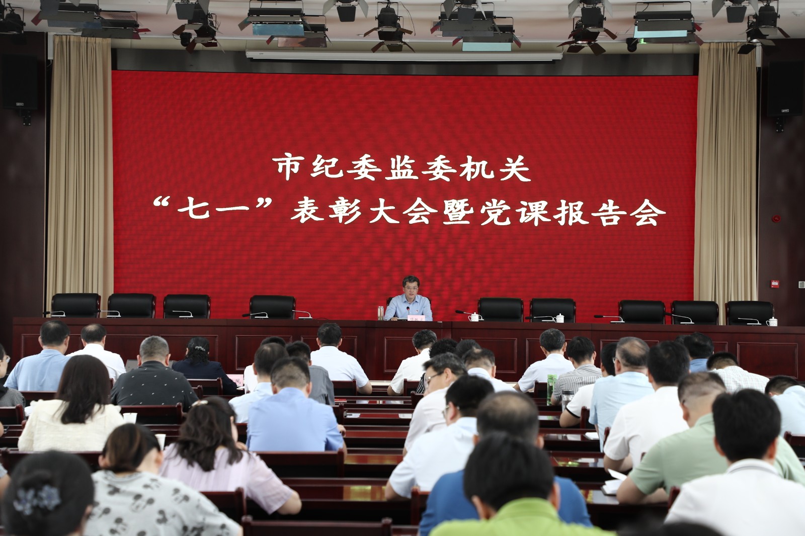 7月1日下午,蚌埠市纪委监委召开“七一”表彰暨党课报告会。市委常委、市纪委书记、市监委主任项跃文为14名优秀共产党员代表颁奖并作党课辅导报告。市纪委监委机关、市委巡察办全体在职党员参会。