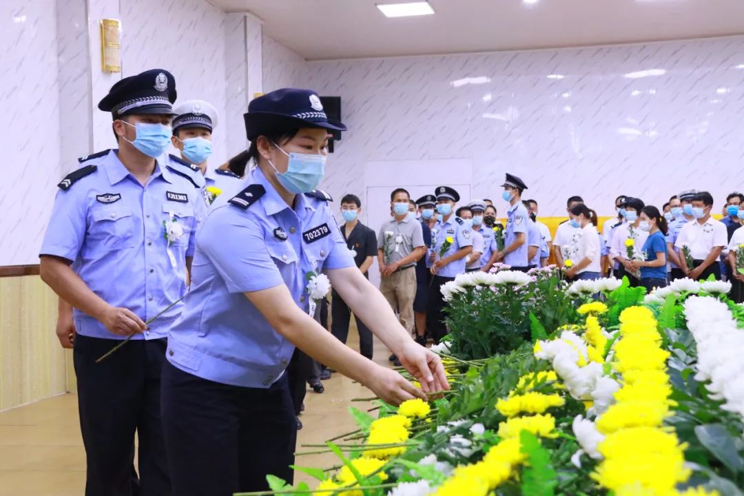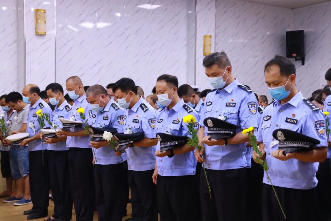 在悲恸的哀乐中,参加告别仪式的有关领导、公安民警辅警、亲属好友向黄明盛遗像三鞠躬,瞻仰遗容敬献鲜花,做最后的告别,挥泪送别昔日的好战友、好兄弟。