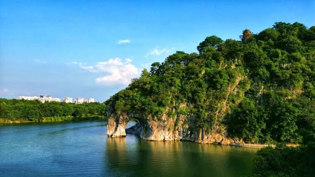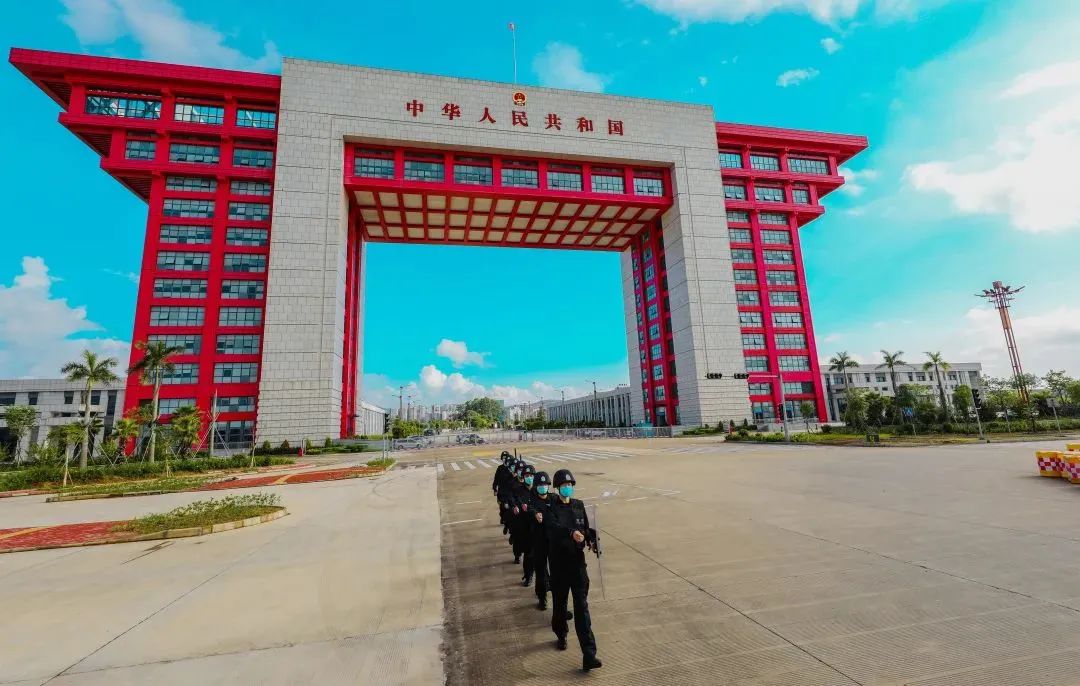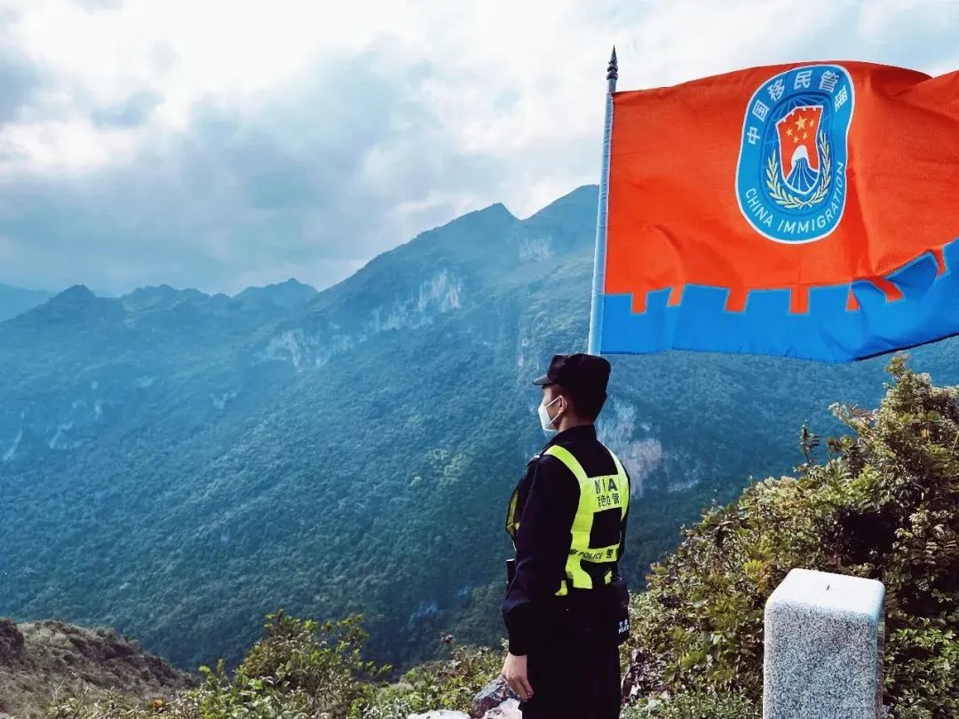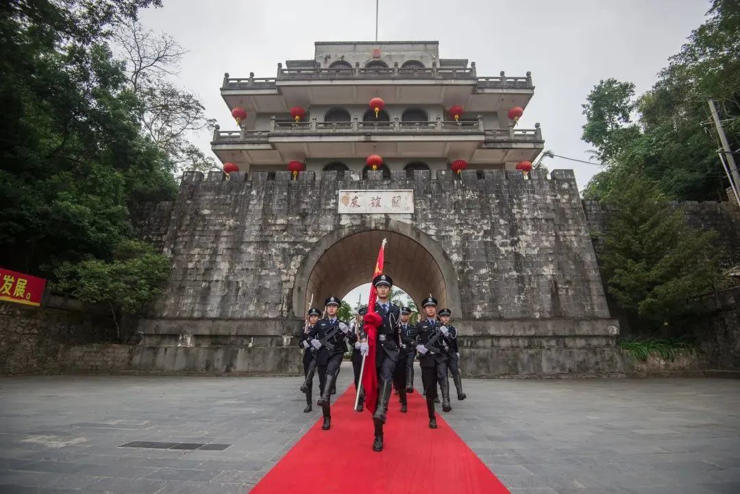 友谊关边检站移民管理警察在友谊关城楼前举行升旗仪式。(陈荣佳摄)