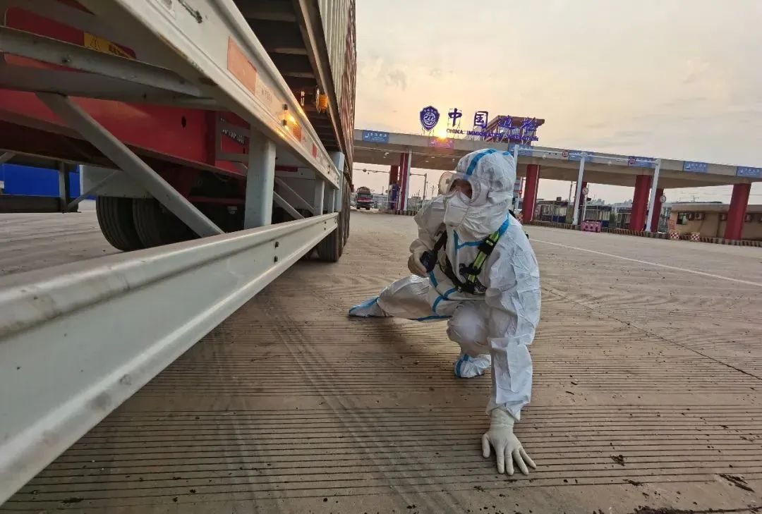 东兴边检站移民管理警察正在检查出入境货车。(黄浩铭摄)