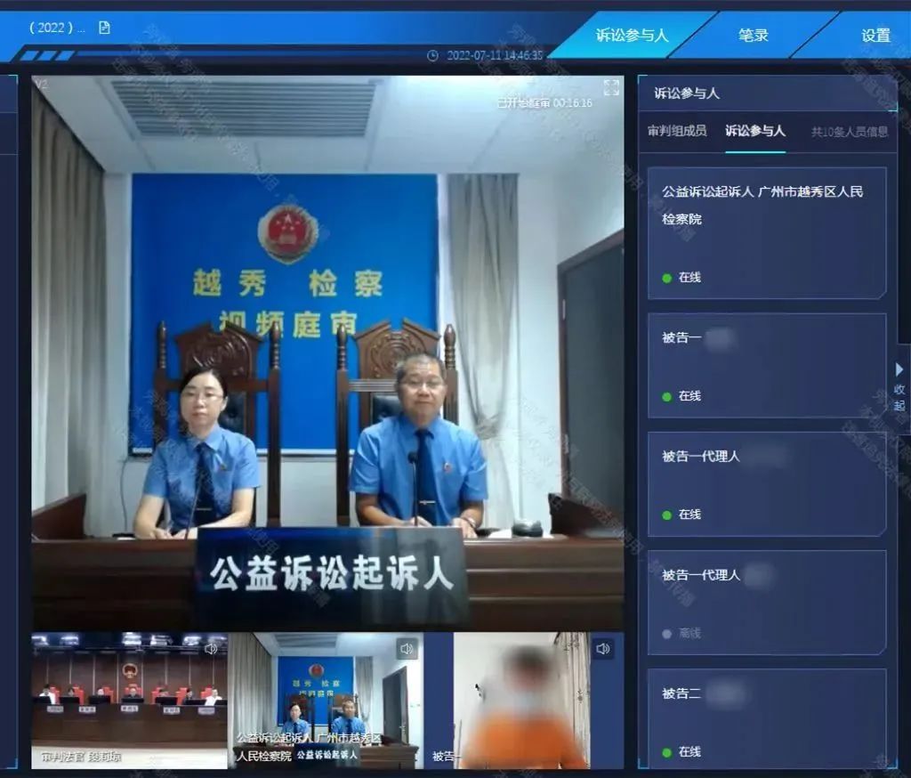 今年2月25日,广州互联网法院公开审理此案,越秀区检察院检察长林伟忠作为主办检察官出庭,广州互联网法院副院长邵山作为审判长审理本案,郑某等4名被告及其代理律师通过互联网参与该案庭审。
