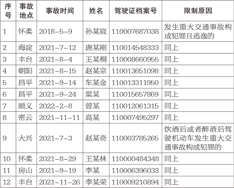 7月17日,北京公安交管部门公布了12名终生禁驾人员名单,其中发生交通事故逃逸构成犯罪的8人;饮酒后或者醉酒后驾驶机动车发生交通事故构成犯罪的4人。他们均被依法追究刑事责任,同时根据道路交通安全法规定,驾驶证被公安机关交管部门依法吊销且终生禁驾。