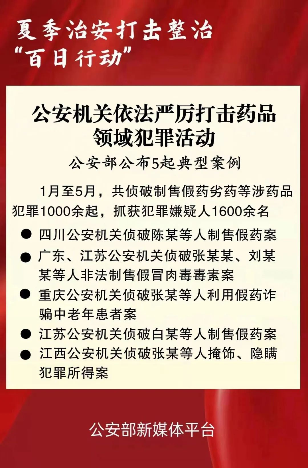 为深入贯彻习近平总书记关于药品安全工作的重要指示精神,按照公安部党委部署要求,全国公安机关依法严厉打击制售假药劣药等药品领域犯罪活动,全力保障人民群众生命健康和用药安全。公安部今日公布5起典型案例,以有力震慑违法犯罪活动,提高广大人民群众防范意识和抵御能力,积极营造全社会共同维护药品安全的良好氛围。