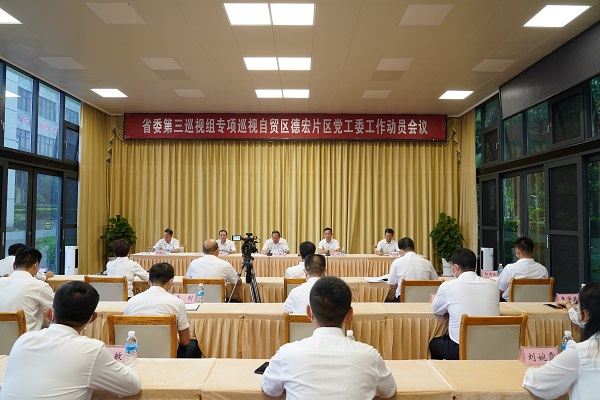按照省委统一部署,7月28日下午,省委第三巡视组专项巡视自贸区德宏片区党工委工作动员会召开。会前,巡视组组长程猛主持召开与德宏州委常委、瑞丽市委书记、瑞丽试验区党工委副书记兼自贸试验区德宏片区党工委书记毛晓的见面沟通会,通报了巡视任务,提出了工作要求;巡视组副组长谢添才传达了省委书记王宁听取巡视工作有关情况汇报时的讲话要求。会上,程猛作了动员讲话;谢添才通报了干扰、对抗巡视的一些典型问题;毛晓主持会议并作表态发言。