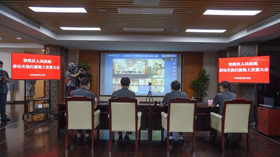 根据疫情防控工作需要,从网上立案、电子送达到执行案款线上发放,以往现场发放款项的形式也改为线上视频会议发放的形式。执行承办法官通过视频连线告知执行申请人相关案件的执行情况,随后在线释明此次欠薪保障金申请的情况及后续发放流程。会后,普陀法院将发放案款打入32名申请执行人的指定收款银行账户。