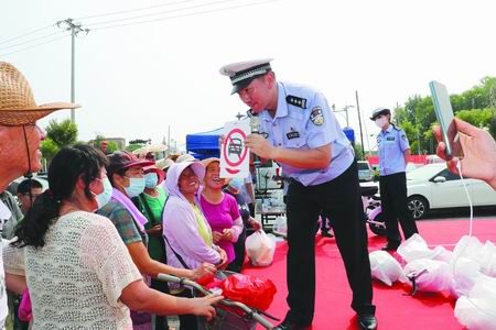 “很多人都知道佩戴安全头盔发生事故时能保安全,但如何正确佩戴,大家都知道吗?”“外出时千万别坐超员车,大家知道车辆超员的危害吗?”8月5日上午,在西青区精武镇牛坨子村的集市内,交警通过互动问答和现场演示等方式,向来赶集的群众详细讲解交通安全知识。为进一步提升乡镇居民交通安全意识和遵法守规自觉性,号召更多群众自觉守法、文明出行,公安交管部门与属地村镇共同策划了此次“交通安全赶大集”美丽乡村行主题活动。