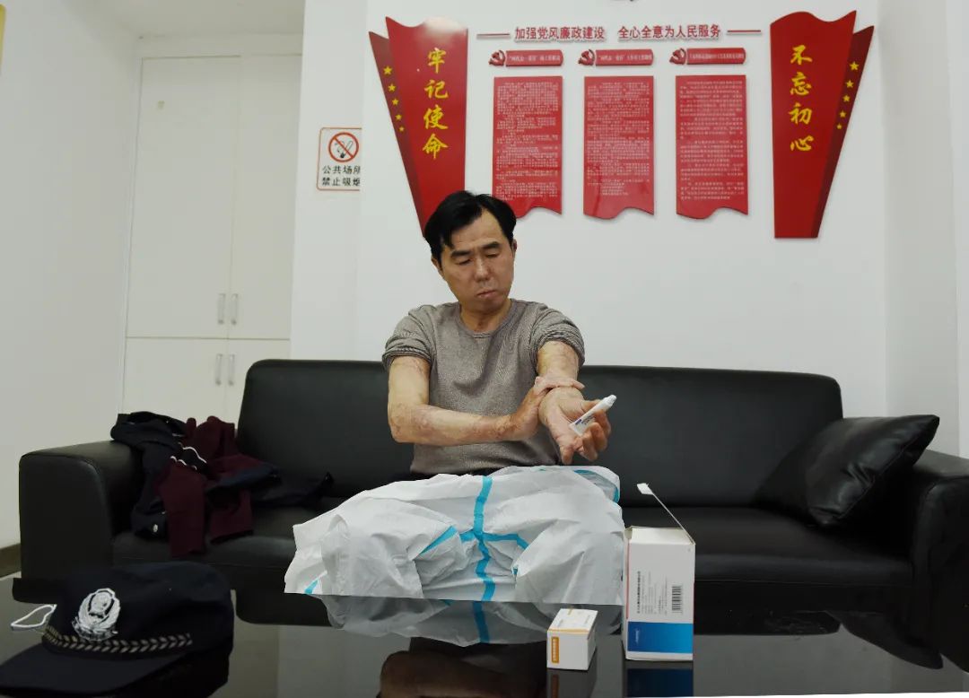2022年3月疫情再度反弹,陈磊主动请缨,坚持每天在辖区隔离点值守。对于正常人而言,防护服不过是热一点、闷一点,但对于全身汗腺被破坏的陈磊来说,这无疑是一个巨大的挑战,同事劝他、社区居民也劝他,倔脾气的陈磊不愿意被特殊对待,仍然坚持每天穿着厚重不透气的防护服,奔波在疫情防控一线的各个岗位。