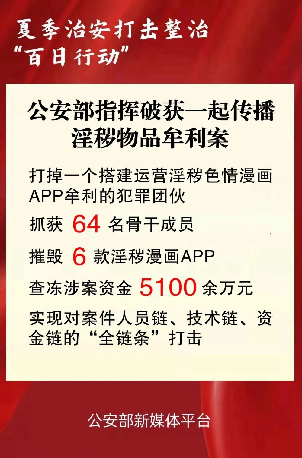 日前,在公安部治安管理局指挥部署下,15个省区市公安机关开展集中收网,成功破获一起传播淫秽物品牟利案,打掉一个搭建运营淫秽色情漫画App牟利的犯罪团伙,抓获64名骨干成员,摧毁6款淫秽漫画App,查冻涉案资金5100余万元,实现对案件人员链、技术链、资金链的“全链条”打击。