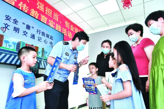 河北区司法局联合区妇联、交警河北支队新开河大队,在新开河警区服务站开展“安全‘童’行我做起,文明交通记心中”普法宣传教育活动,通过发放普法宣传单、播放普法视频等形式,进一步增强了小朋友们的交通安全意识。图为交警向小朋友们介绍交通法规。