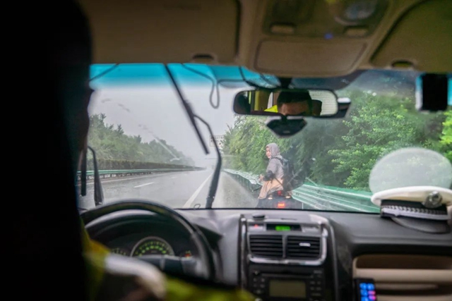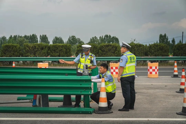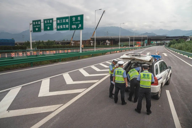 李一和同事一边站在路旁警戒后方来车,一边给驾驶员指示,前面不远就有高速下口,引导其尽快驶入安全道路。