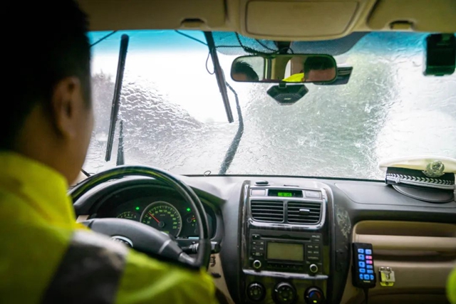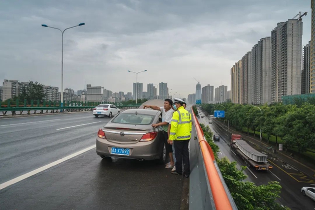 巡查结束,各个关键点都未因暴雨造成影响。一辆小车停在应急车道,经上前询问得知是因紧急制动而发生故障。