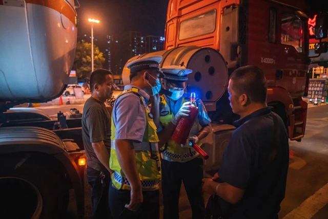 检查运送危爆物品车辆的灭火器,高速安全无小事,灭火器如果有问题,一旦出现险情无法使用,后果将不堪设想。