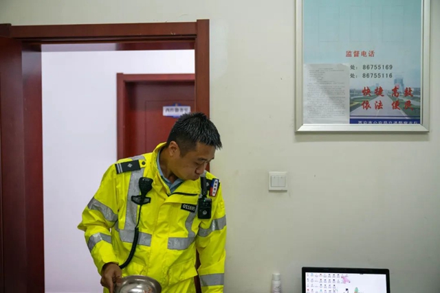李一担心早上巡查路段的积水情况,边换衣服边吃饭,就要出发。