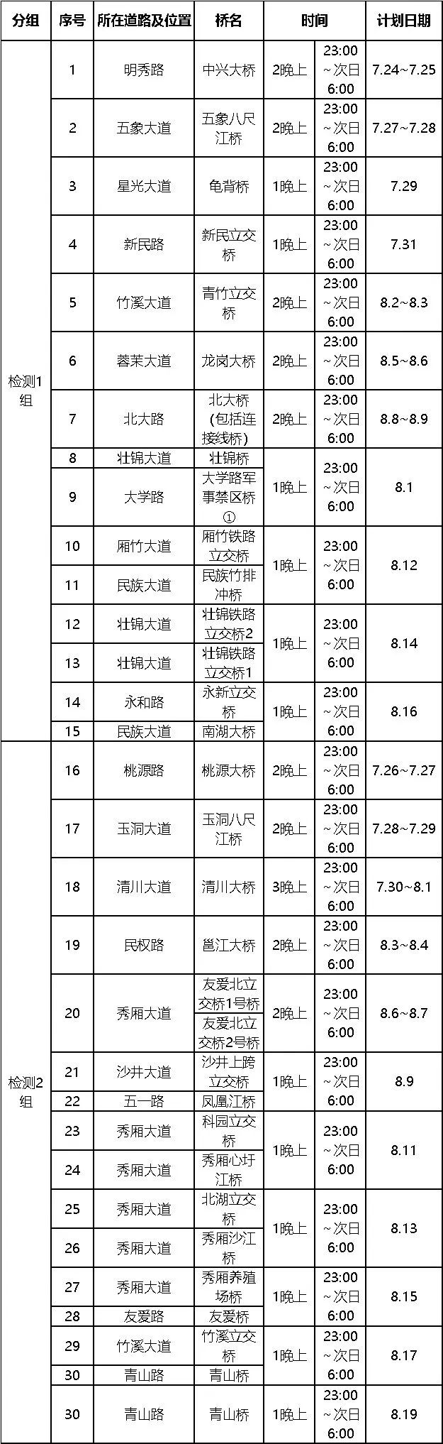南宁市公安局交通警察支队 2022年7月22日 30座桥梁交通组织及时间安排汇总表