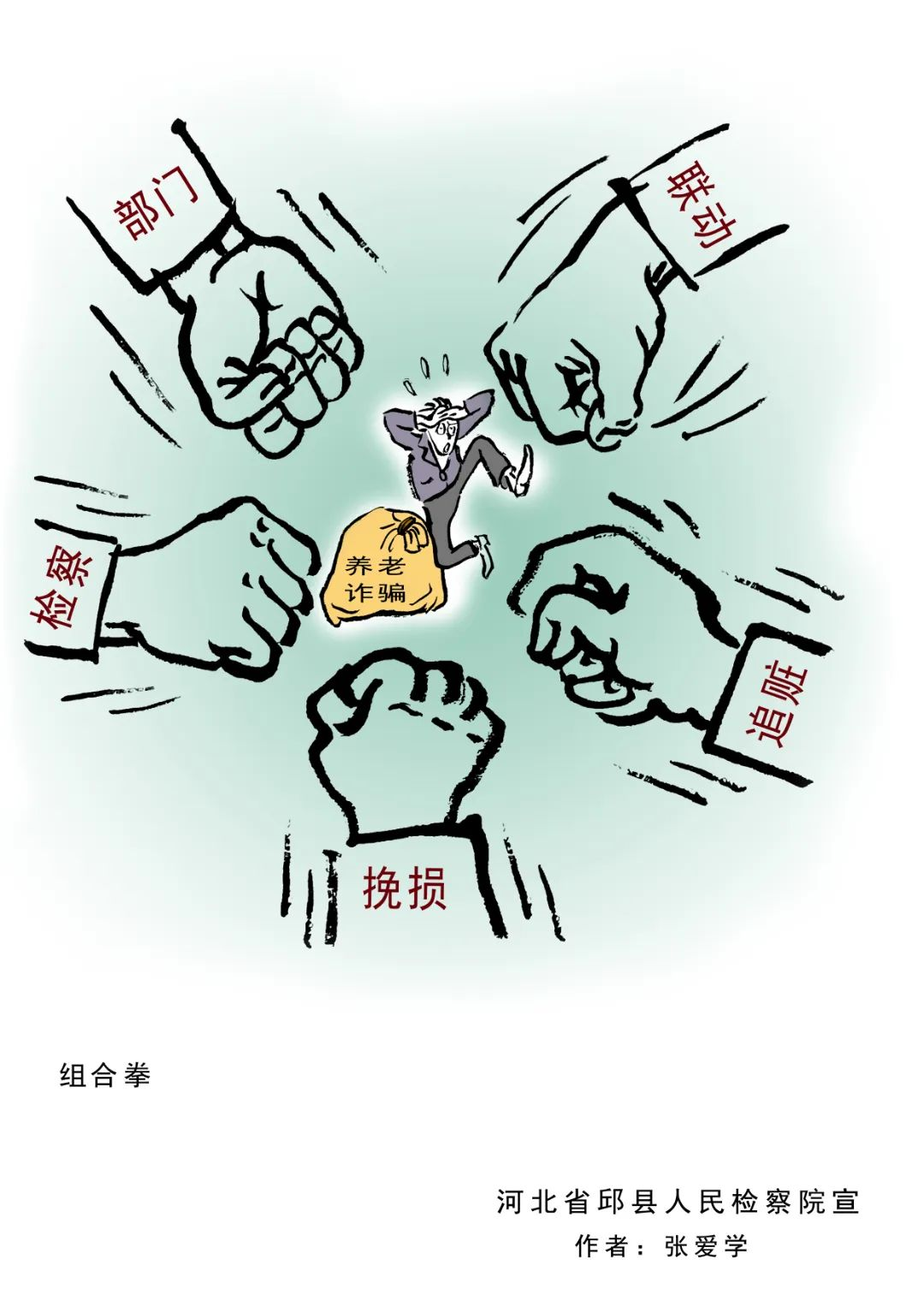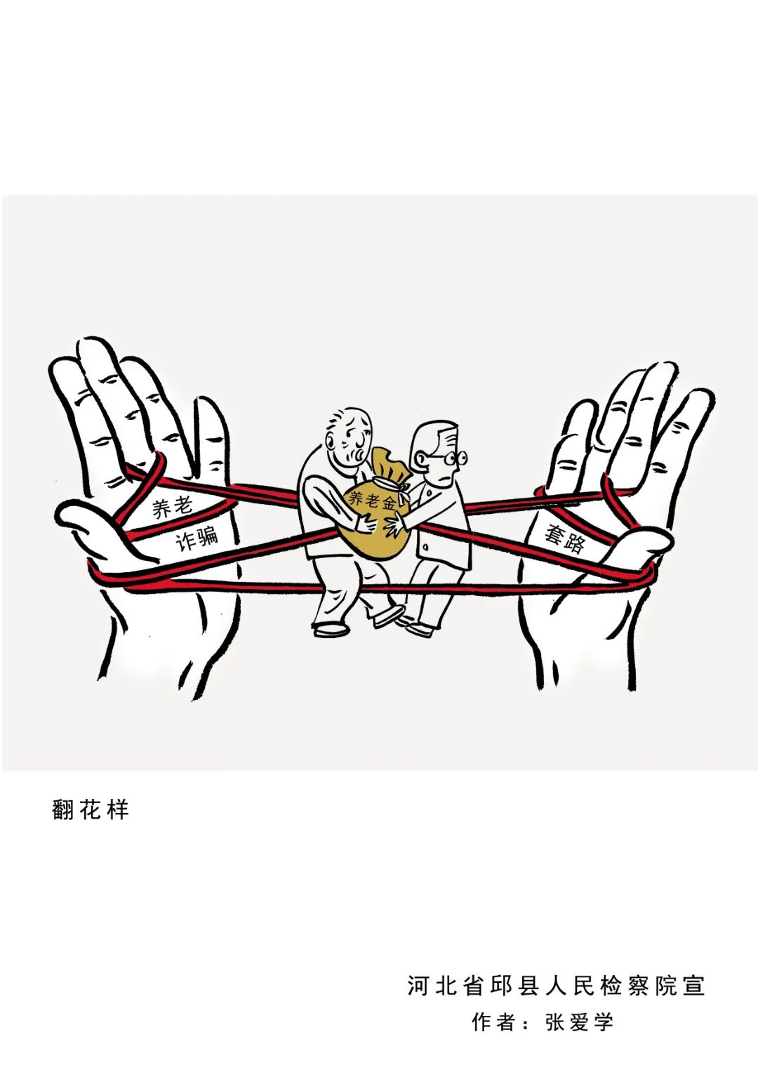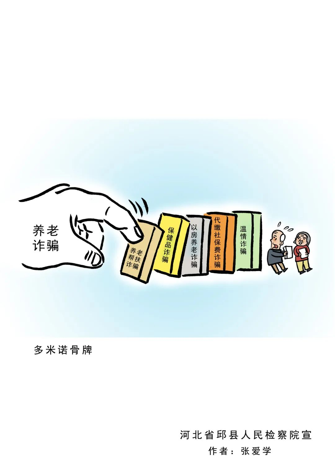近年来,以提供“养老服务”、投资“养老项目”、销售“养老产品”、代办“养老保险”等为名,侵害老年人合法权益的各类诈骗违法犯罪行为时有发生,给老年人造成了财产损失和精神伤害。邯郸邱县人民检察院借助“漫画之乡”优势,立足检察职能,制作了防范养老诈骗系列漫画。这些漫画形象、生动、幽默,让人过目不忘,犹如一双“慧眼”,帮助群众轻松识别诈骗套路,提醒广大群众特别是老年人,要提高警惕,不贪图小利、不轻信他人,让不法分子“不敢骗、不能骗、骗不了”。