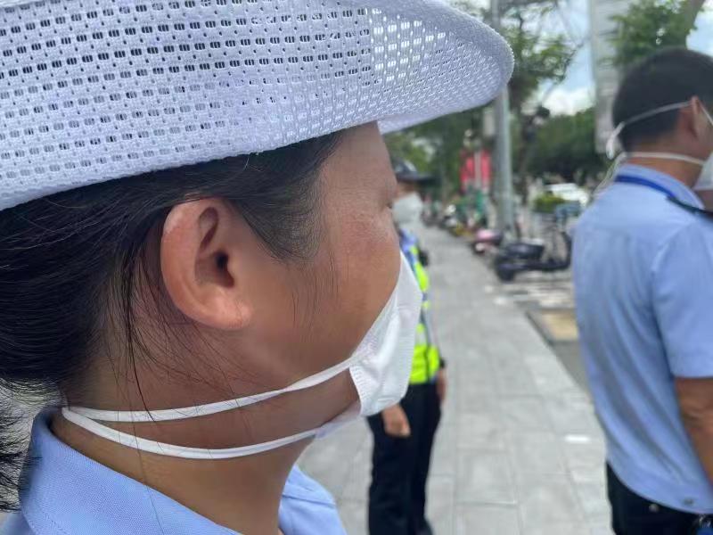 8月18日下午,正在执勤的杨媛媛被路过的群众提醒口罩戴得不对,但真相是,连续的户外执勤导致耳朵被狠狠晒伤,还起了大水泡,挂耳式口罩已无法使用,只能采用头系式的口罩。