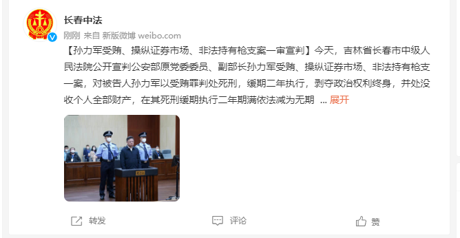 【孙力军受贿、操纵证券市场、非法持有枪支案一审宣判】今天,吉林省长春市中级人民法院公开宣判公安部原党委委员、副部长孙力军受贿、操纵证券市场、非法持有枪支一案,对被告人孙力军以受贿罪判处死刑,缓期二年执行,剥夺政治权利终身,并处没收个人全部财产,在其死刑缓期执行二年期满依法减为无期徒刑后,终身监禁,不得减刑、假释,以操纵证券市场罪判处有期徒刑八年,并处罚金人民币一百万元,以非法持有枪支罪判处有期徒刑五年,决定执行死刑,缓期二年执行,剥夺政治权利终身,并处没收个人全部财产,在其死刑缓期执行二年期满依法减为无期徒刑后,终身监禁,不得减刑、假释;对孙力军受贿犯罪所得及孳息依法予以追缴,上缴国库。